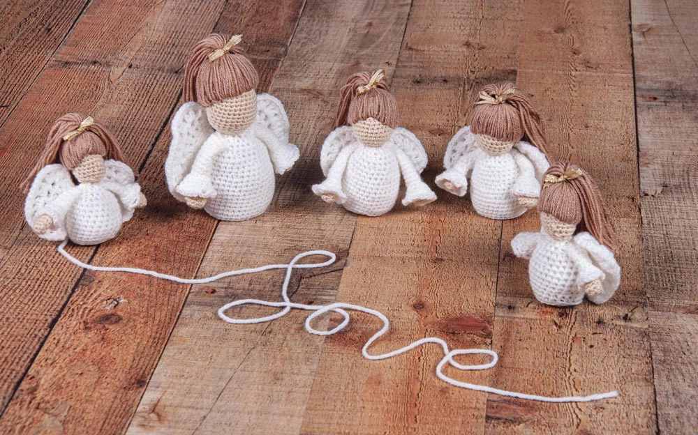 Adorable angels for your home. Kit makes 5. Includes pattern and materials to 3 different size angels ( Sizes 3.5, 4.75 and 6″). Requires crochet hook E-4 and polyfill. Available in 2 color combinations.