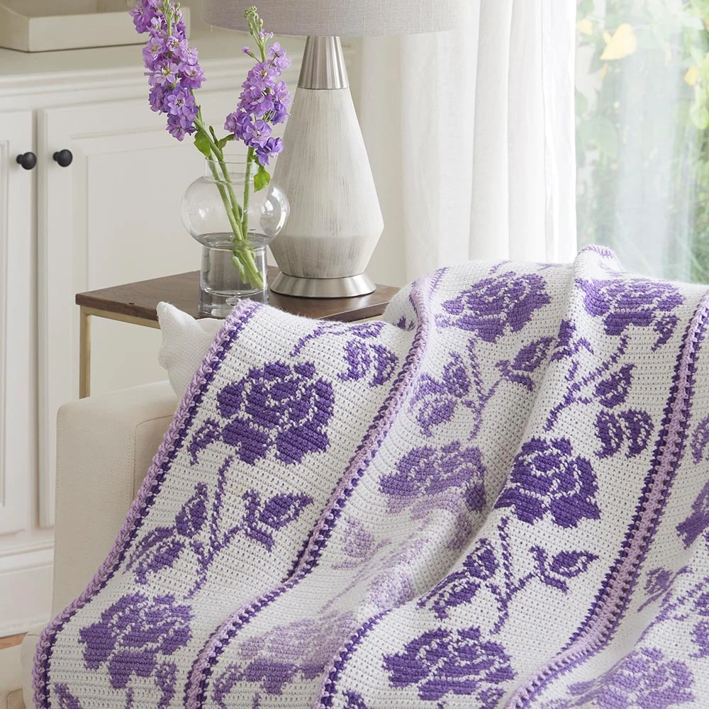 Designed by Dorothy Warrell. Panels are worked in tapestry crochet. Kit includes Red Heart Super Saver and Super Saver Ombre yarns. Requires crochet hook H-8 (5 mm). Size 48″ x 67.5″. Intermediate crochet.