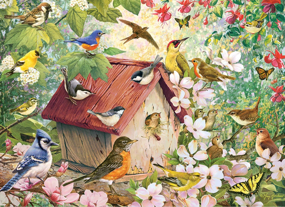 It’s Blooming Spring and the birds will tell you all about it. They have a new birdhouse to gather at, which is surrounded by beautiful cherry blossoms and butterflies. It looks like every bird in the neighborhood knows about the new fledglings and they’ve come to extend their welcome. This 1000 piece bird puzzle features robins, blue jays, blue birds, golden finch, nuthatches, cardinals and more! Size 26.5 x 19″.