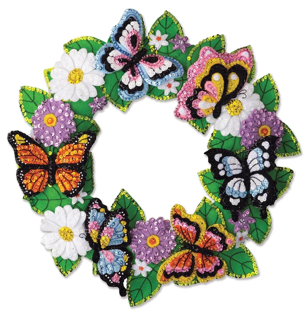 Enjoy the beauty of spring with this colorful felt wreath full of butterflies and flowers. Kit includes felt, sequins, beads, floss, needle and instructions. Size 16.5″ x 16.5″.