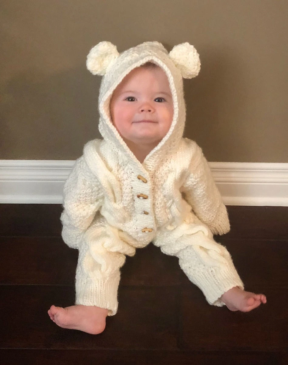 Sweet and snuggly cabled teddy bear romper for baby. Kit includes toggle buttons and Mary Maxim Aran Irish Tweed or Twist yarn and pattern. Requires 24″ Circular Knitting Needle size 8.