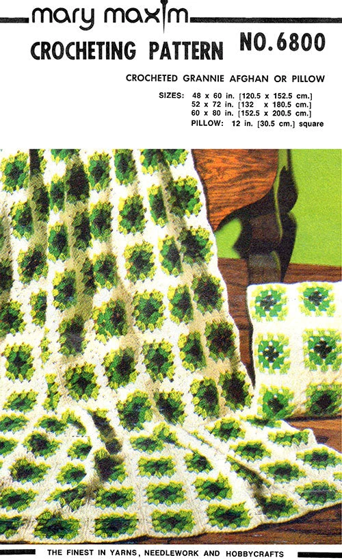 Crochet a classic afghan and pillow set using this vintage pattern. A traditional favorite with young and old. It’s so easy and fast to crochet the separate Mellowspun granny squares you sew together to finish. Originally created with Mary Maxim Mellowspun Orlon, which had 420 yards per skein. You will find Mary Maxim Mellowspun and all the current sport weight yarn selections, here. Please note, yardages may have changed.
