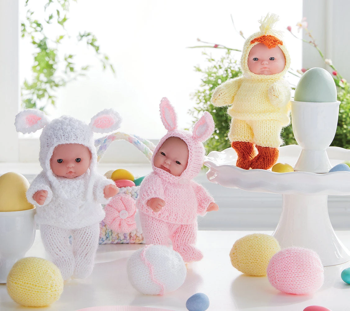 Fun Easter outfits for your 5″ Lots of Love Dolls! Kit includes Mary Maxim Twinkle and Baby’s Best yarn, buttons and one 5″ doll to make collection as shown. Additional 5″ Lots of Love Dolls sold separately here and here. Requires Needles size 1, 2 and 6, Double Point Needles size 2, Stitch Markers, and Polyfill.