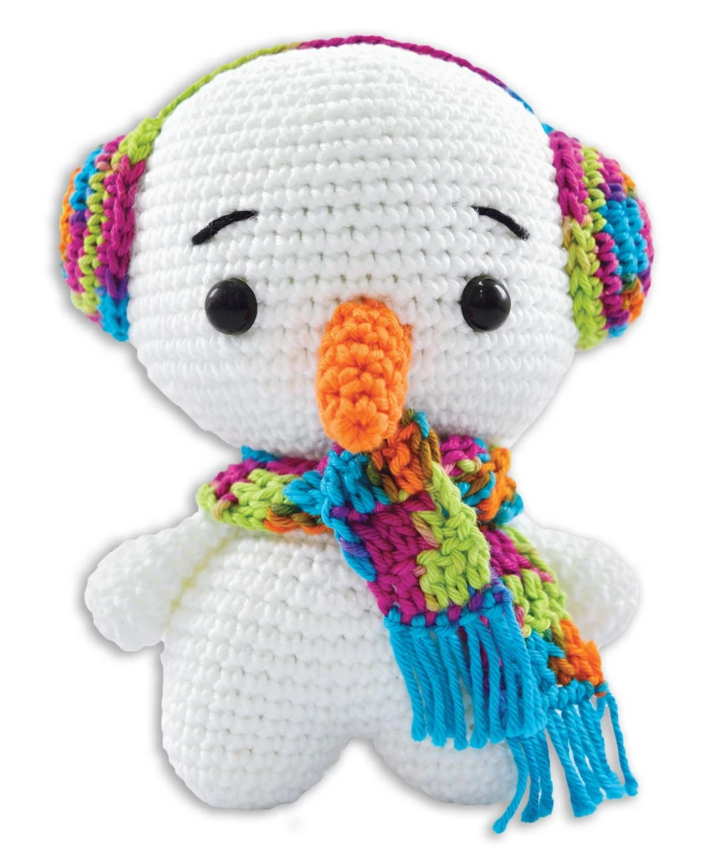 Snowman with bright scarf and ear muffs is sure to cheer you up on a blustery day! Kit to crochet includes Amigurumi yarn, crochet hook, tapestry needle, eyes, filling fiber, stitch marker and pattern. Approximately 6″ tall.
