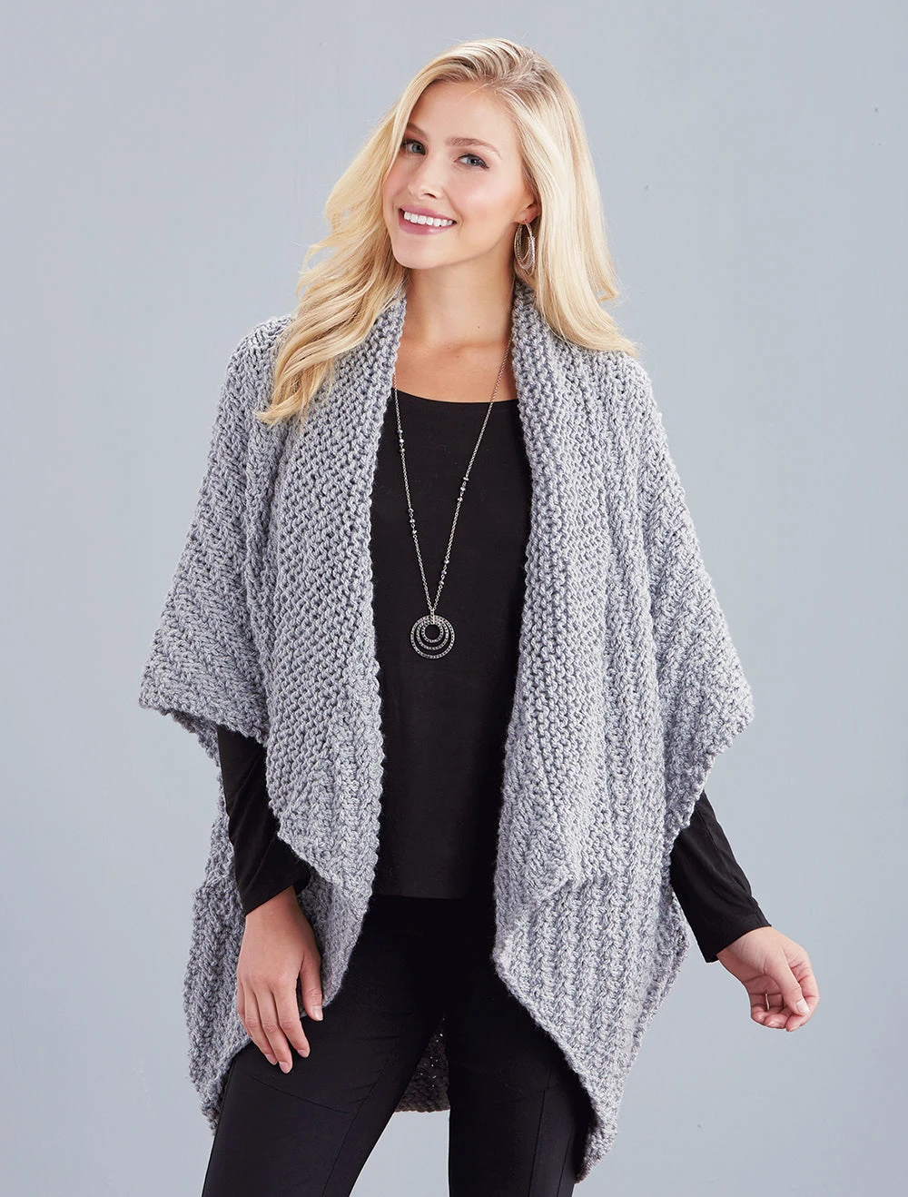 Long, cozy vest, in relaxed style, for a little extra warmth. Kit includes Mary Maxim Titan yarn and pattern. Requires 36″ Circular Needle Size 11 (8 mm) and Stitch Markers.