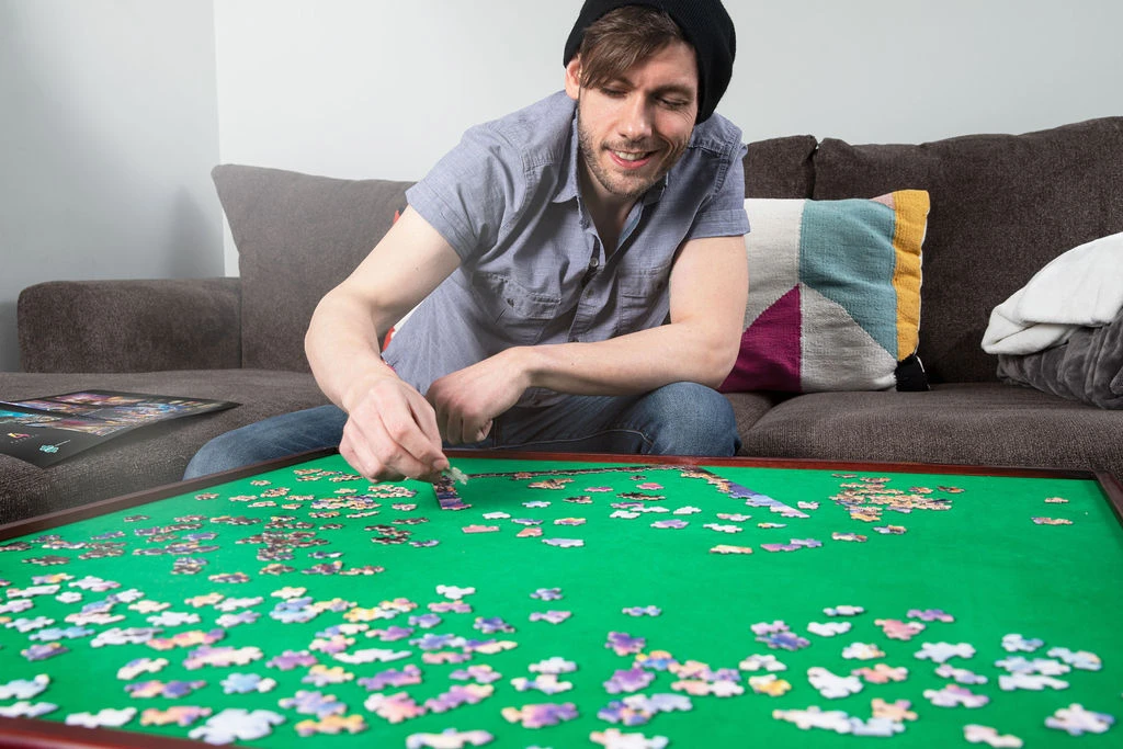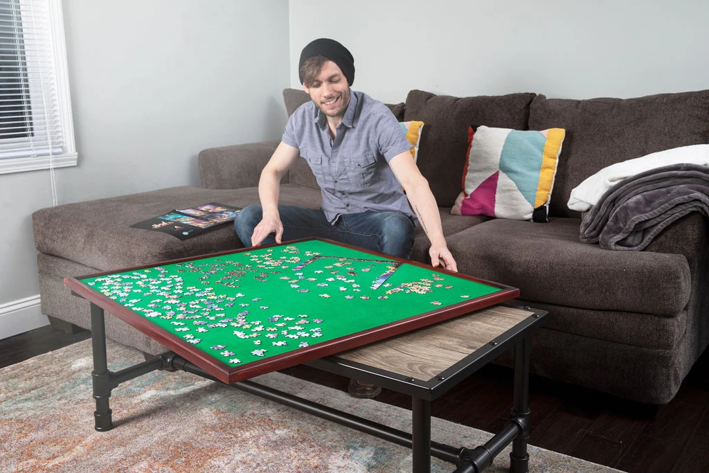 The latest innovation in puzzle assembly surfaces! Now you don’t have to stretch to reach the far corners, you just turn the spinner to reach the section you need. Includes durable swivel system and non-slip felt top to keep your pieces secure on the surface. Size 35″ x 35″ x 2″. Holds most 1500 piece puzzles up to 34″ x 34″ (felt area). Made of durable composite wood and solid hardwood.