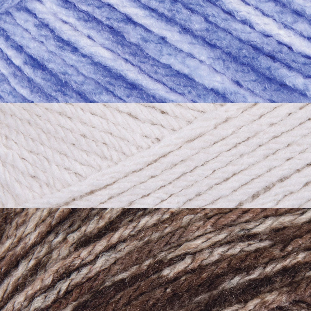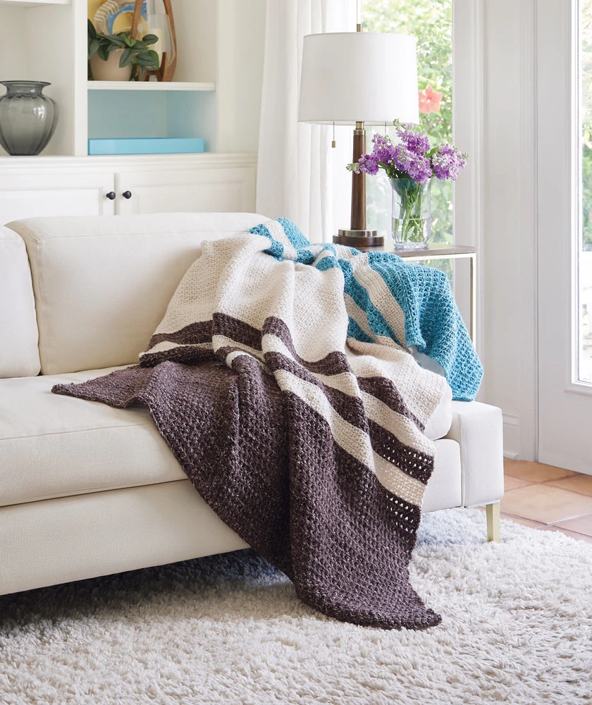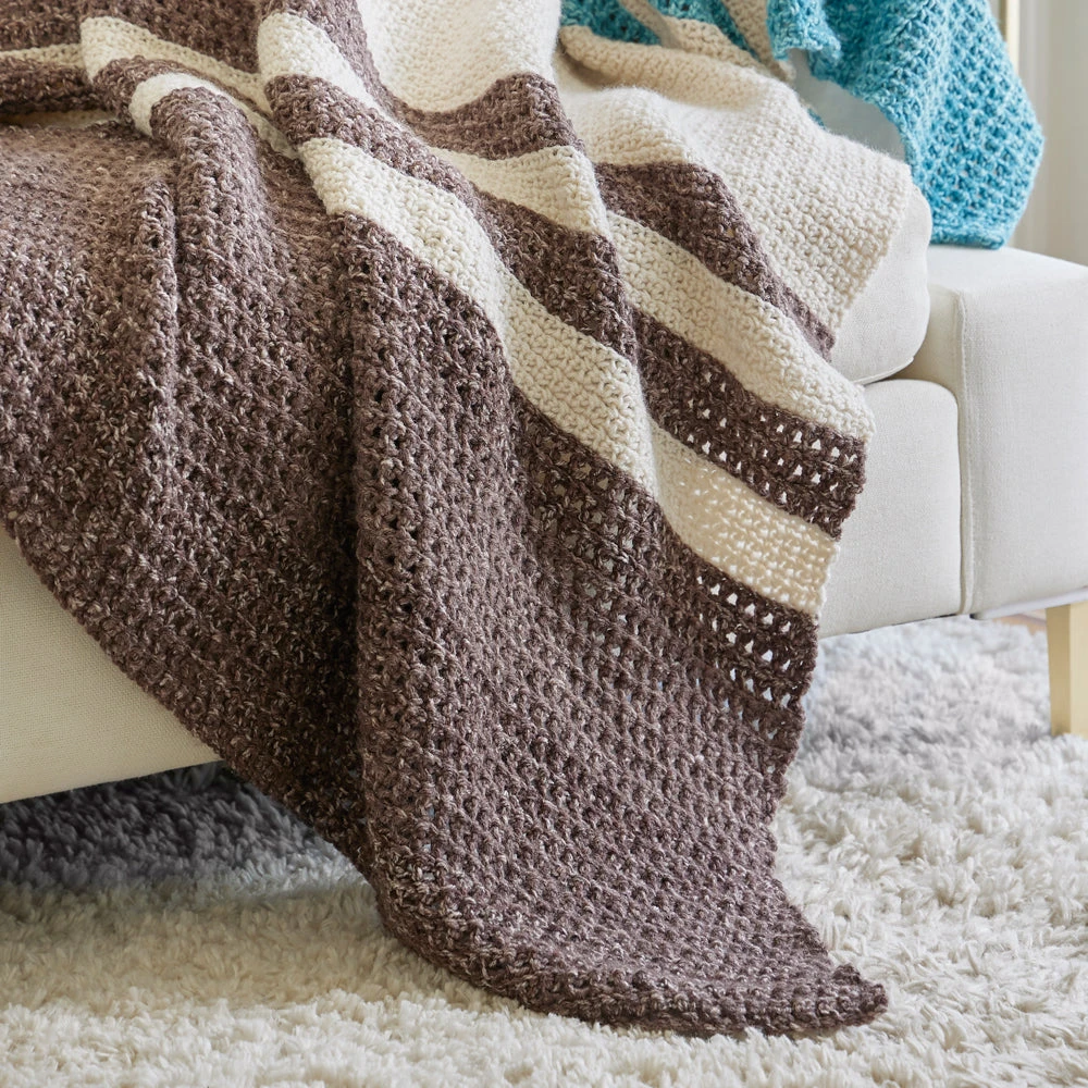 Bold stripes of color and textures will enhance any room. Kit includes Mary Maxim Starlette yarn and pattern. Requires crochet hook I-9 (5.5 mm). Size 47″ x 62.5″. Intermediate crochet.