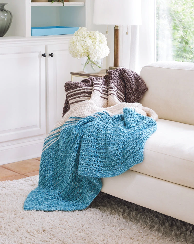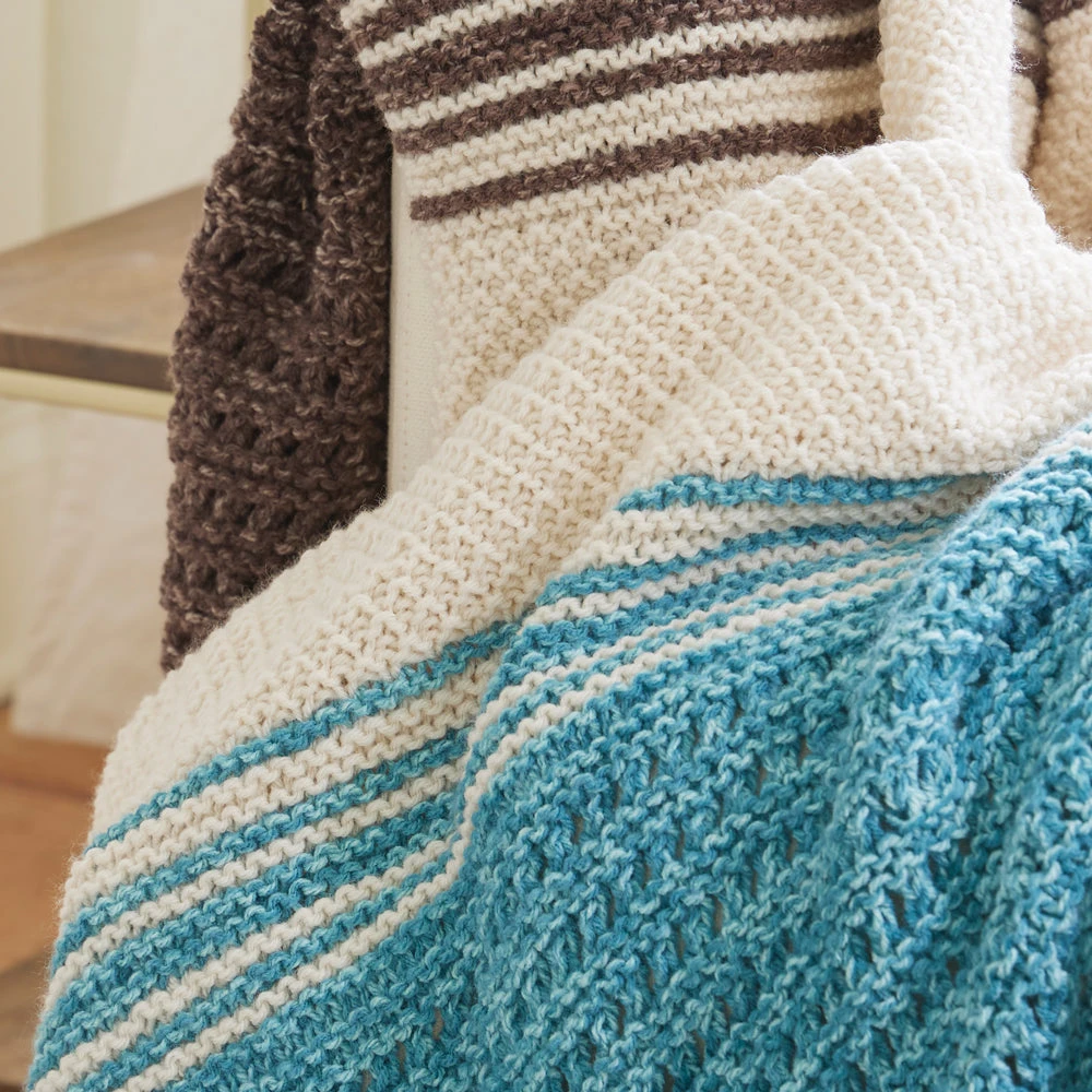 Bold stripes of color and textures will enhance any room. Kit includes Mary Maxim Starlette yarn and pattern. Requires 32″ circular needle size 9 (5.5 mm). Size 48″ x 60″. Intermediate knit.