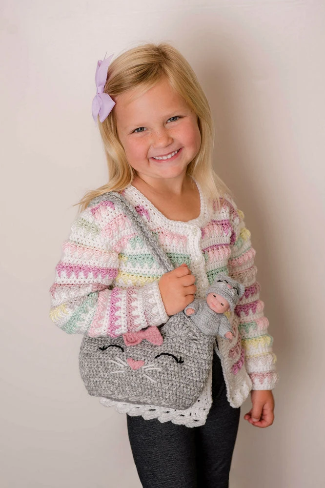 A silky soft cardigan for your little one. Kit includes Mary Maxim Lullaby and Sunrise yarns and pattern. Requires crochet hook H-8. Intermediate Crochet.