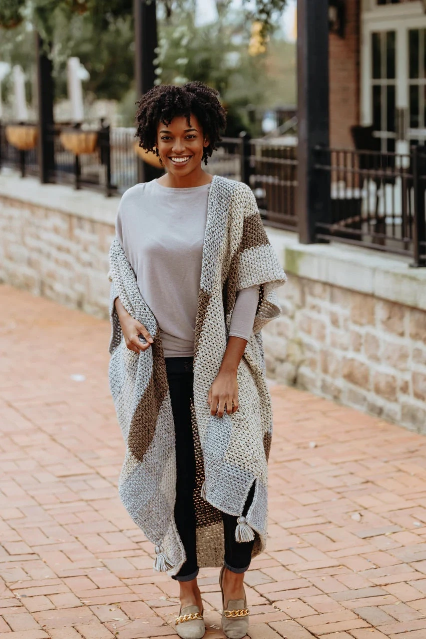 A trendy cardigan in neutral colors and subtle details. Make a bold style statement in this Patchwork Cardi. Its eye-catching tassels and open front ensure a look you’ll always stand out in. Crafted with short sleeves and a long body for easy layering, this statement piece will take your fashion game to the next level! Designed by TL Yarn Crafts. Kit includes Lion Brand Vanna’s Choice yarns and instructions. Requires crochet hook size 7.0 mm. One size fits most adults. Size 34 x 39″. Intermediate Crochet.