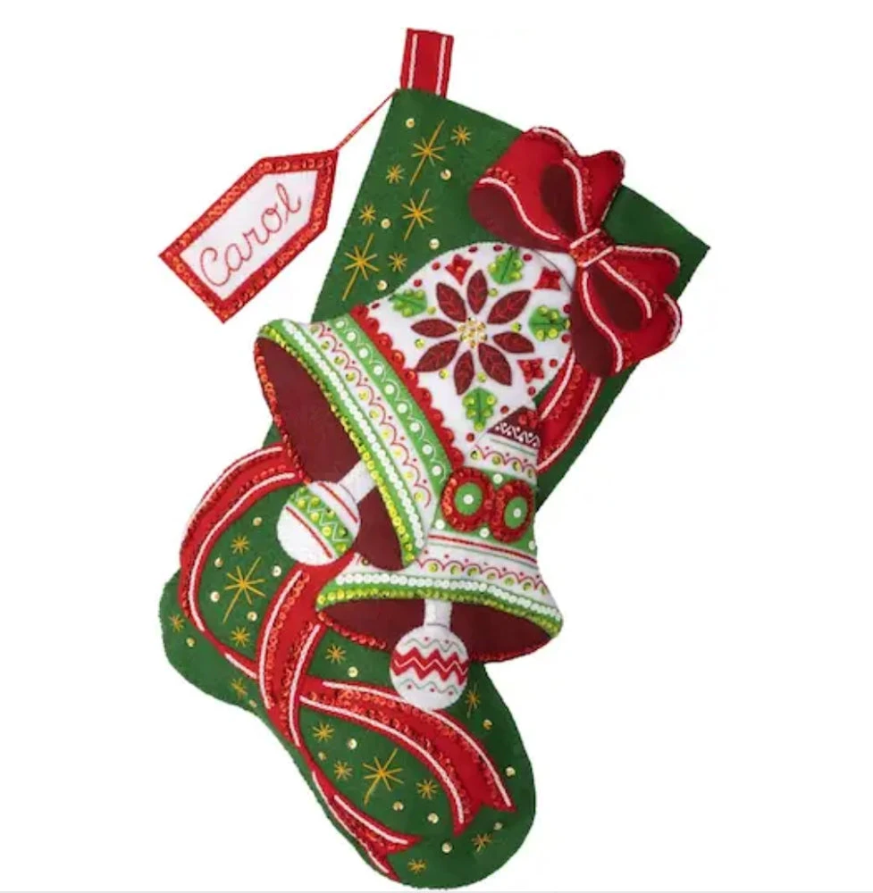 Celebrate the holidays with the Bucilla Poinsettia Bells Felt Stocking Kit. This beautiful stocking features a pair of dazzling poinsettia bells and red ribbon. This embroidery kit includes the basic materials needed to create an 18” stocking including stamped felt, cotton embroidery floss, separated sequins and beads, embroidery needles, and instructions. Size 18″ long.