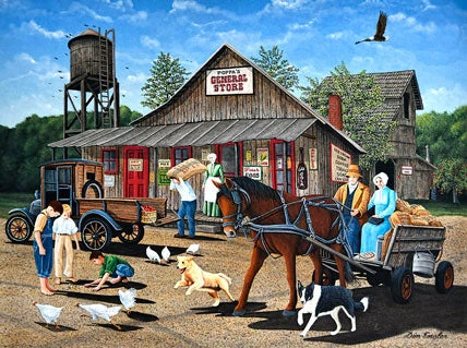 Stopping to pick up feed at Poppa’s General Store. 1000 pieces. Size 27 x 20″.