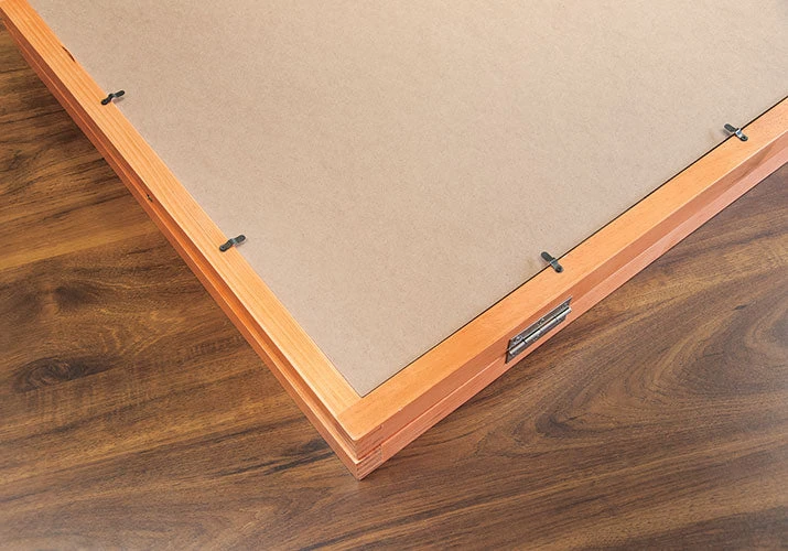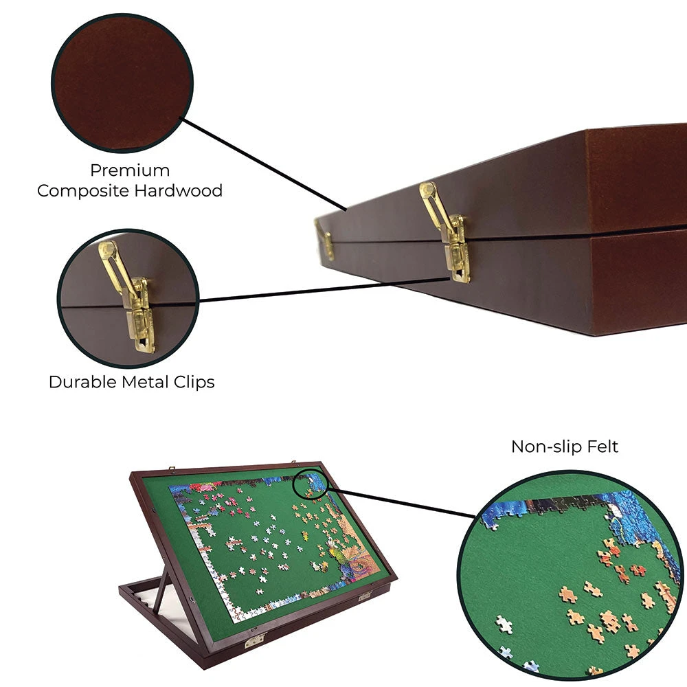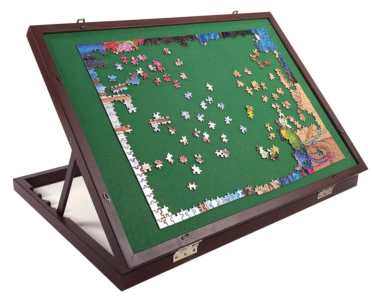 Make puzzling a breeze with this hardwood framed puzzle board case. The board is adjustable, allowing you to select different angles for comfort. The felt work surface keeps the pieces securely in place. This table folds flat and features a special cover that clips over the puzzle to hold it firmly in place to sore the puzzle when you aren’t working on it. Size 24″ x 34″.