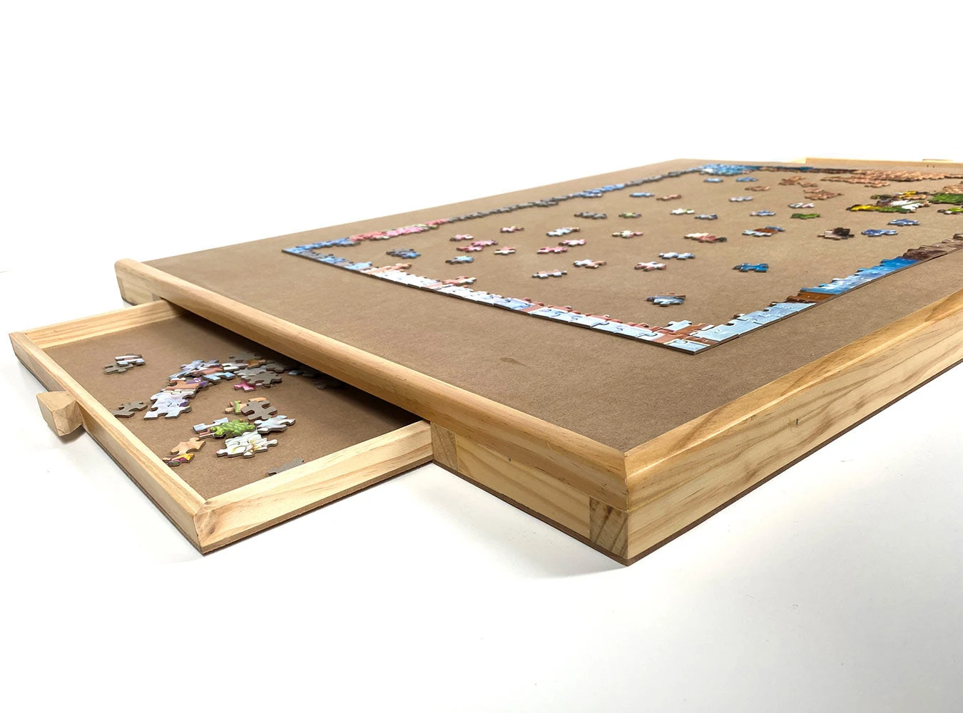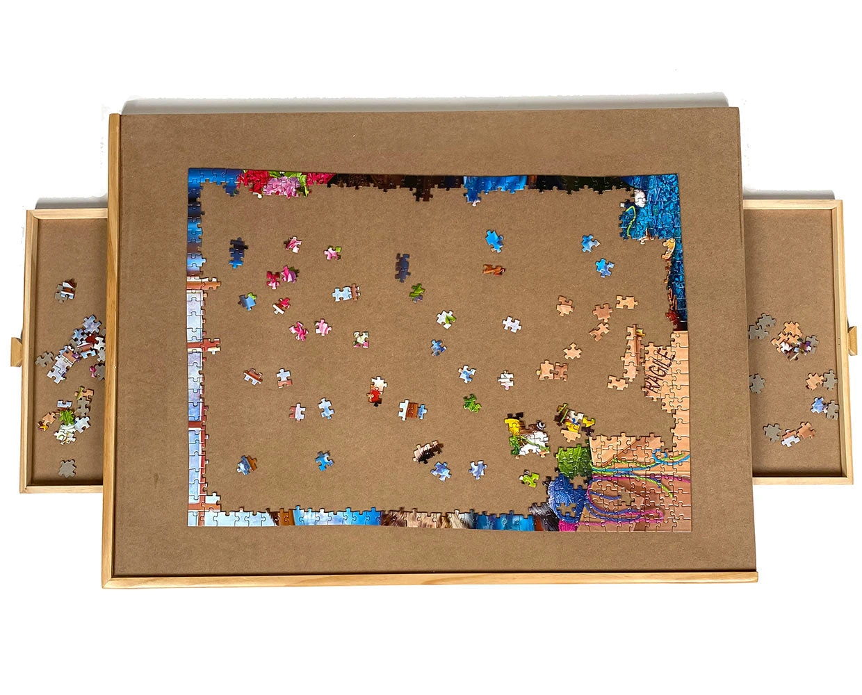 A virtually indestructible place to keep your working puzzle. Two wooden sliding drawers sort/hold your pieces. Smooth fiberboard surface.