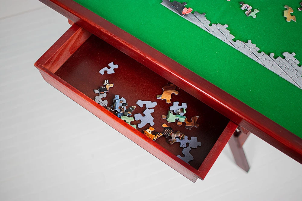 A must-have for every puzzle enthusiast! This exclusive puzzle table features premium wood with a non-slip felt top (35 x 35″). Includes two slide out drawers to store your extra pieces and folds flat for easy storage. Some assembly required.
