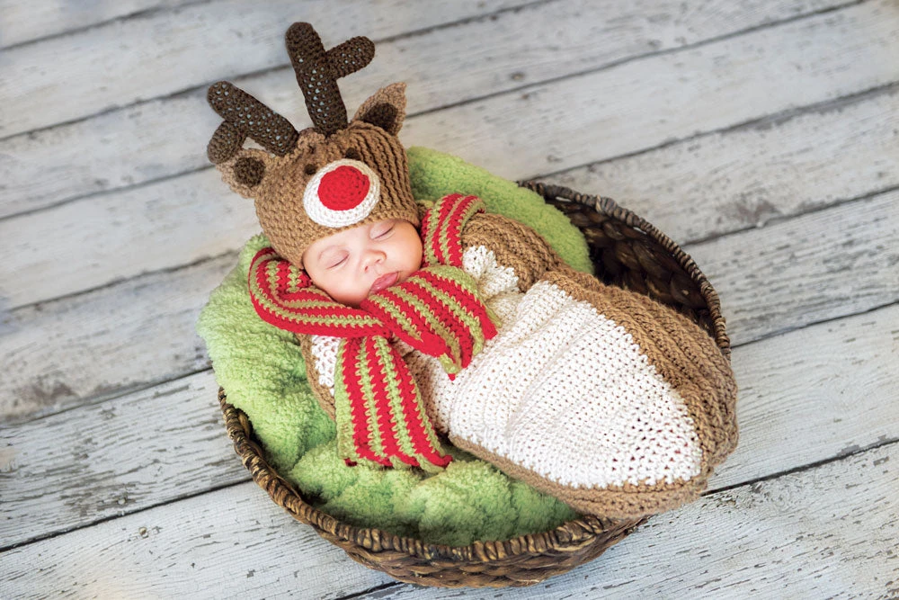 Dress your baby up for the holidays in this adorable set! Kit includes Mary Maxim Mellowspun DK yarn. Requires crochet hooks G-6 ( 4 mm) and H-8 (5 mm). Size 20″ circ. x 23.5″ long.