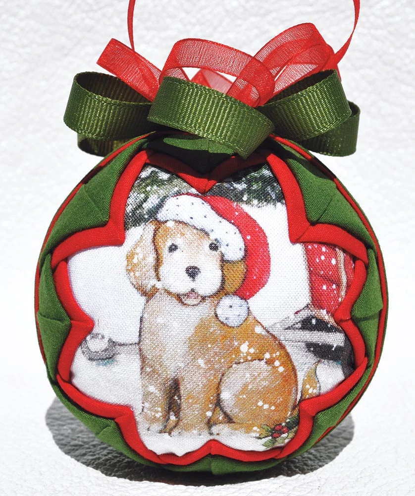 This unique quilted ornament looks hand sewn, but it’s not! No sewing required. Simply fold fabric and pin in place with easy to follow instructions. Kit includes foam ball and all materials to make one ornament as shown with different dog picture on each side. Size 3″ diameter.