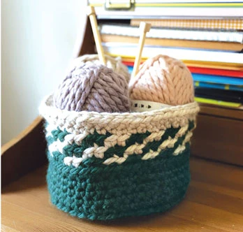 The cutest checked basket to hold your current project. Kit includes Lion Brand Touch of Alpaca Thick & Quick yarn and pattern. Requires crochet hook N-13. Size 5.5 x 8″. Easy Crochet.