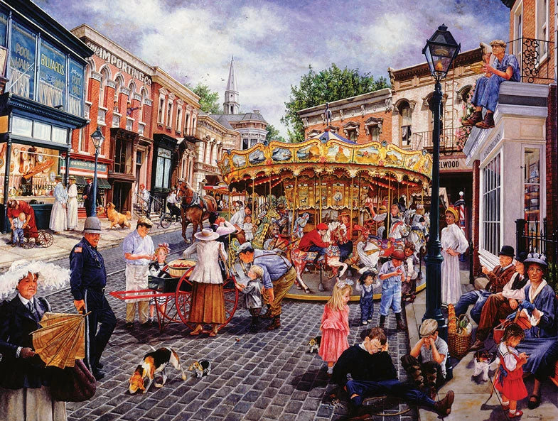 The kids are enjoying the carousel in the middle of town. 1000 pieces. Size 35 x 27″.