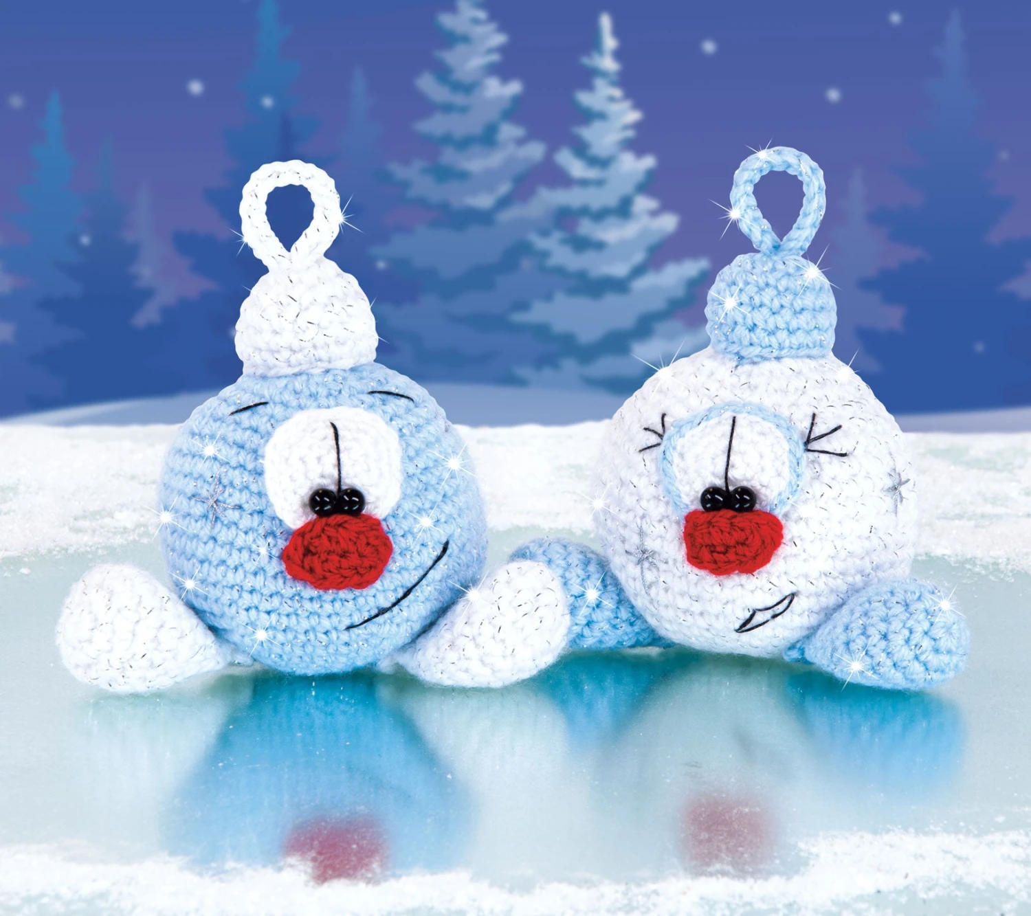 This quirky pair will be the life of your home for the holiday season. Kit includes Mary Maxim Starlette Sparkle yarn and trims to make 2 of each design. Requires crochet hook G-6 and polyfill, not included. Size 6″ tall with hanger. Intermediate Crochet.