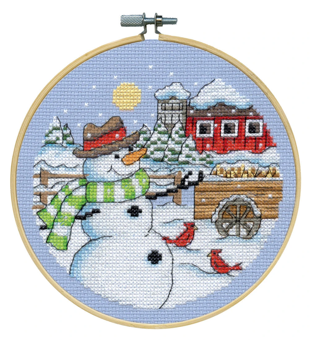 A beautiful winter scene. Counted cross stitch kit includes 100% cotton 14 ct. aida, 100% cotton embroidery floss, 6″ embroidery hoop, needle, chart and instructions. Size 6″ round.